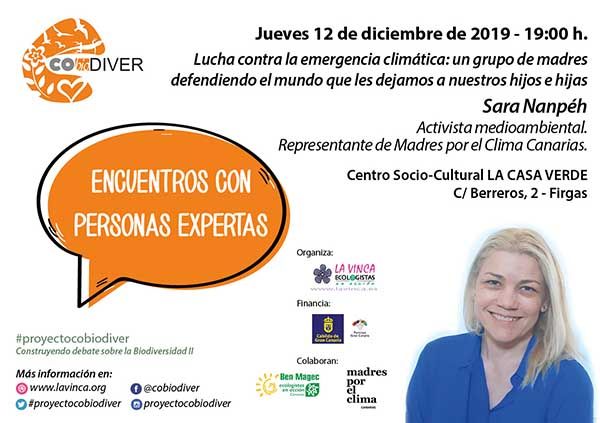 Tras la buena acogida de las tres primeras sesiones de trabajo/debate a cargo del economista Antonio González Viéitez, del periodista Txema Santana y de la investigadora y activista medioambiental Claudia Asensi Zárate, la cuarta de estas sesiones se desarrollará el jueves 12 de diciembre de 2019, a las 19.00 horas, en el Centro Socio-Cultural LA CASA VERDE (C/ Los Berreros, nº 2 – Firgas) y se contará como persona EXPERTA invitada con Sara Nanpéh, activista medioambiental y representante de Madres por el Clima Canarias, quien hablará sobre LUCHA CONTRA LA EMERGENCIA CLIMÁTICA: UN GRUPO DE MADRES DEFENDIENDO EL MUNDO QUE LES DEJAMOS A NUESTROS HIJOS E HIJAS, con el siguiente formato:
