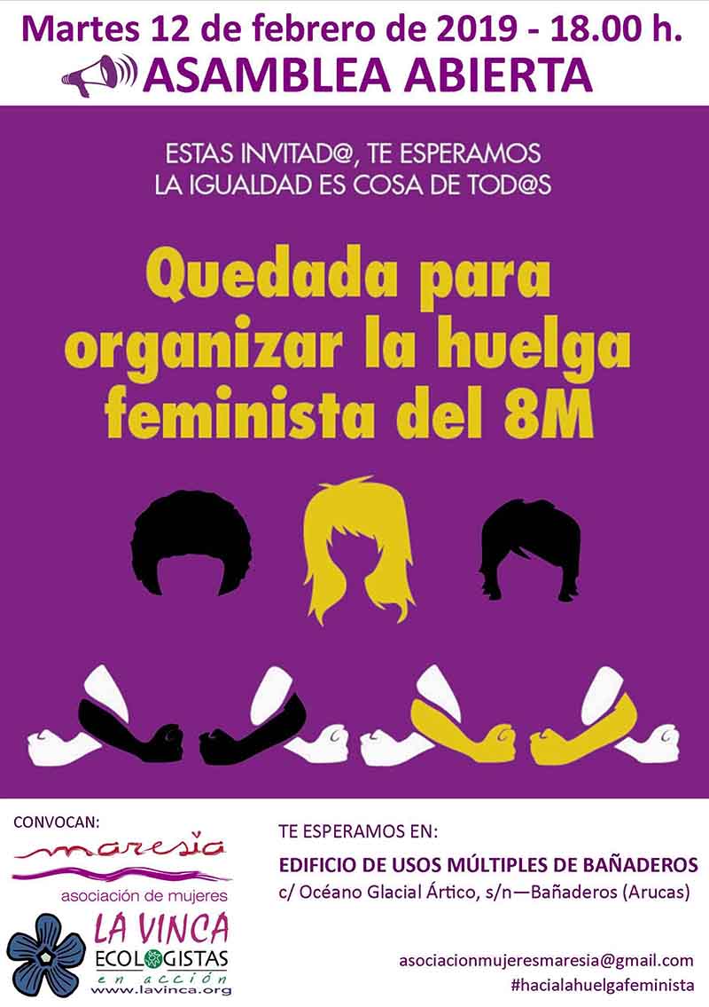 En la tarde-noche del martes 12 de febrero de 2019, a las 18.00 horas, está previsto en el Edificio de Usos Múltiples de Bañaderos (Arucas), una reunión en ASAMBLEA ABIERTA de colectivos para preparar los actos a realizar el próximo 8 de marzo, en la zona norte de Gran Canaria como motivo de la convocatoria de Huelga Feminista,