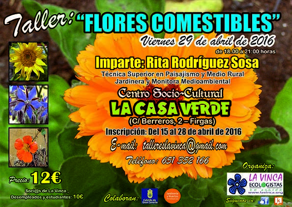 A partir del viernes 15 de abril, se abre el plazo de inscripción para el próximo taller formativo, que lleva por título “Taller de Flores Comestibles” ”, y las personas interesadas en asistir al mismo pueden inscribirse llamando al teléfono 651 352 166 (Comisión de Formación de La Vinca EeA).