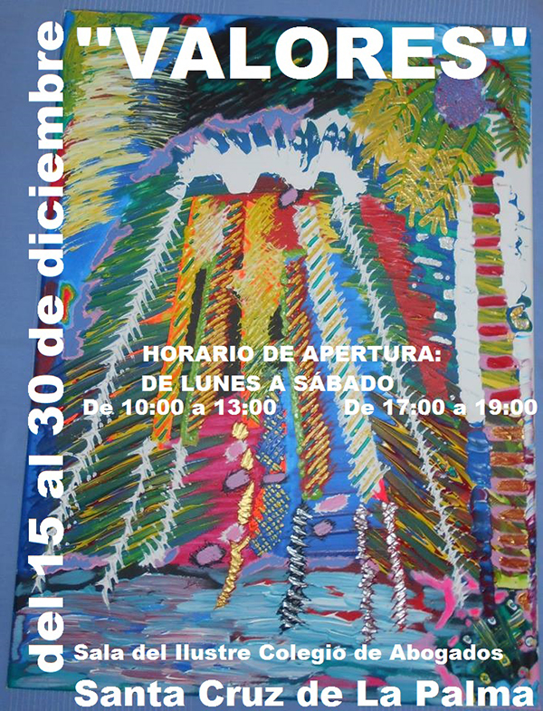 La Sala del Ilustre Colegio de Abogados de Santa Cruz de La Palma, acogerá hasta finales de año, la exposición »Valores», una iniciativa personal de Alejandro Hernández Torres (aficionado al arte), dónde ser podrá disfrutar de la obra de una decena de artistas, y en la que además de descubrir tanto a nuevos valores del arte, como a otros artistas con una amplia trayectoria, será un lugar de encuentro, y diálogo, un espacio común para la cultura.