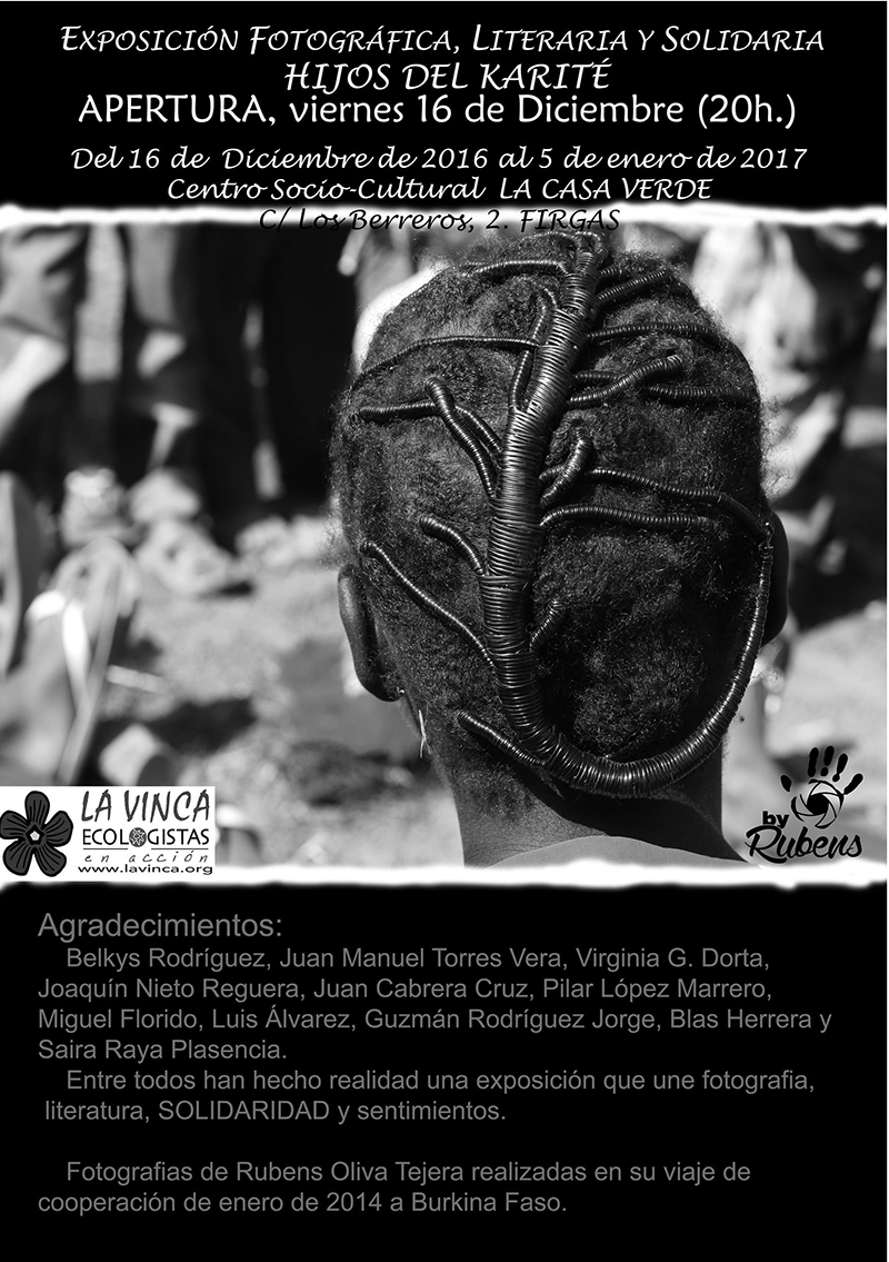 A las 20.00 horas del viernes 16 de diciembre de 2016, por parte del colectivo LA VINCA Ecologistas en Acción se procederá a la inauguración de la Exposición Fotográfica, Literaria y Solidaria “HIJOS DEL KARITÉ”, una muestra integrada por la obra del fotógrafo Rubens Oliva Tejera, que tendrá lugar en la Sala de Exposiciones del Centro Socio-Cultural LA CASA VERDE, sito en la calle Los Berreros, nº 2, de la Villa de Firgas.