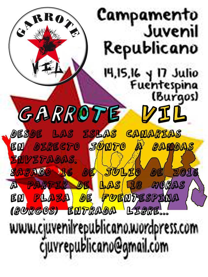 Agenda 16 JULIO. Garrote Vil actuará en el Campamento Juvenil Republicano 13 de julio de 201613 de julio de 2016 Redacción Redacción FacebookTweet La banda canaria actuará el próximo 16 de julio en el Campamento Juvenil Republicano. Las jornadas republicanas se celebrarán los días 14, 15, 16 y 17 de julio en Fuentespina (Burgos).