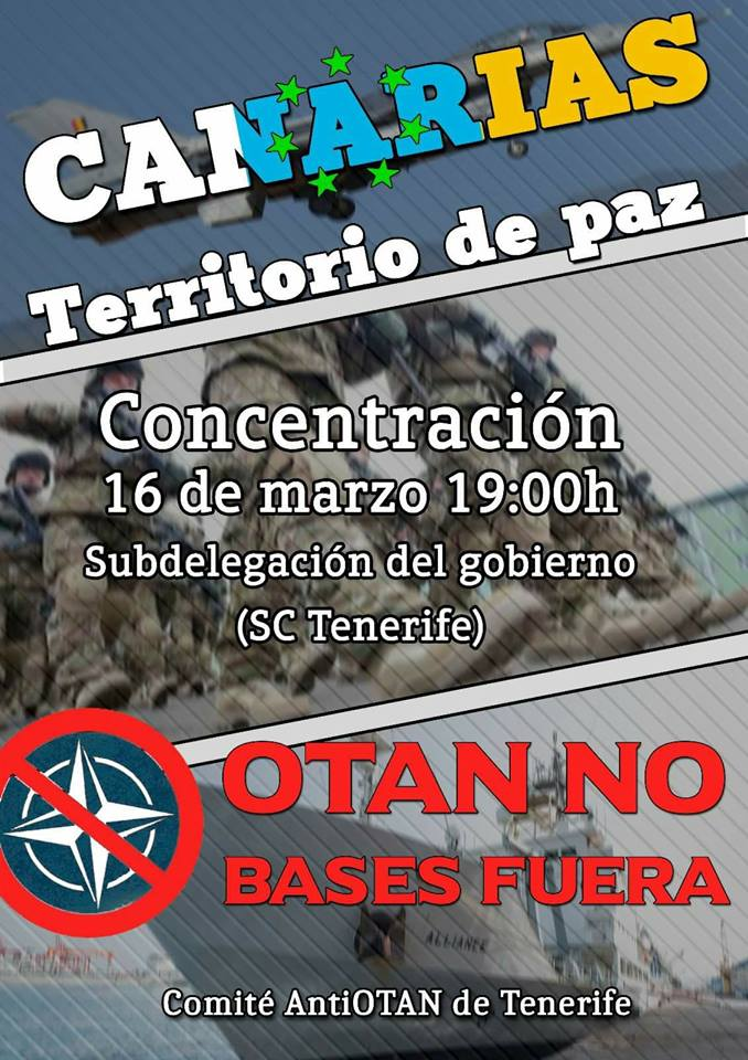 ActualidadAgendaPolíticaResistencia internacionalSociedad 16 MARZO. Concentración “Canarias Territorio de Paz: OTAN NO, BASES FUERA” 15 de marzo de 201715 de marzo de 2017 Redacción Redacción FacebookTweet El Comité AntiOTAN de Tenerife convoca a la ciudadanía a una concentración que tendrá lugar en la Subdelegación del Gobierno español este 16 de marzo a las 19.00 horas.