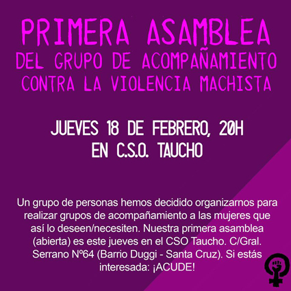 “Un grupo de personas hemos decidido organizarnos para realizar grupos de acompañamiento a las mujeres que así lo deseen/necesiten. Nuestra primera asamblea (abierta) es este jueves en el CSO Taucho. C/Gral. Serrano Nº 64 (Barrio Duggi – Santa Cruz). Si estás interesada: ¡ACUDE!