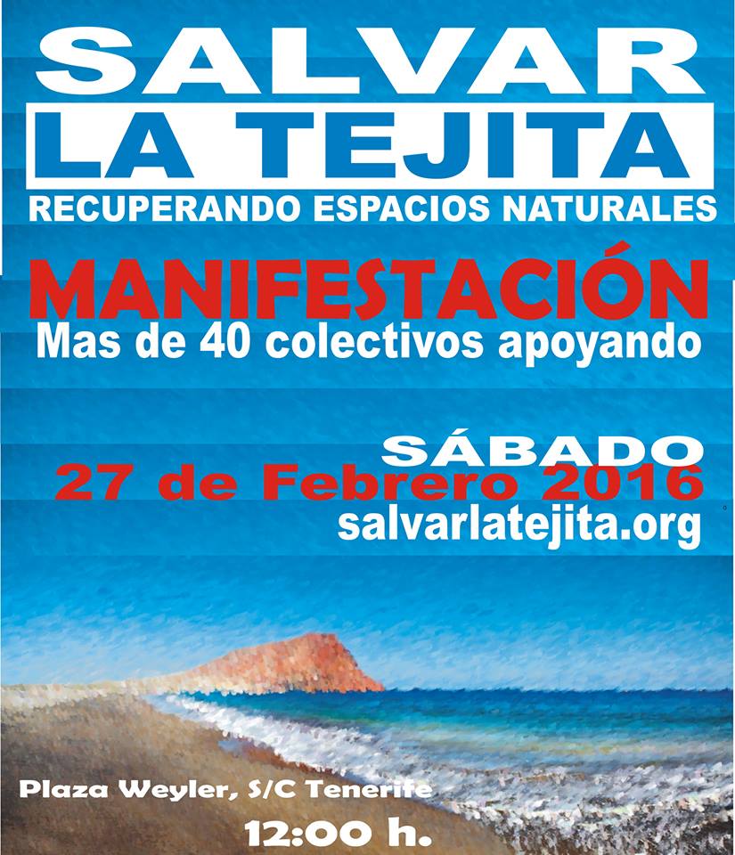 La Plataforma Salvar La Tejita convoca a los medios de comunicación a una rueda de prensa que tendrá lugar el próximo viernes, 19 de febrero, a las 11.00 horas en la Sala 7 Islas del Cabildo Insular de Tenerife (Plaza de España, s/n 38003, Santa Cruz de Tenerife). El objeto de esta convocatoria es la presentación de la manifestación que se ha convocado para el próximo 27 de febrero en Santa Cruz de Tenerife.