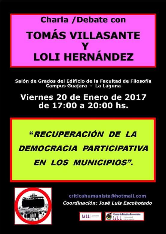 Este viernes 20 de enero tendrá lugar, en el Salón de Grados del edificio de la Sección de Filosofía (Campus de Guajara), la charla/debate “Recuperación de la democracia participativa en los municipios”. La charla será impartida por Loli Hernández y Tomás Villasante, siendo coordinador José Luis Escohotado.