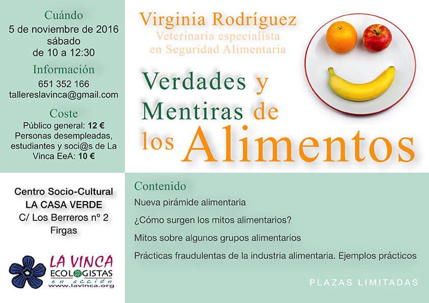 El próximo viernes 21 de octubre, se abre el plazo de inscripciones para el Taller “VERDADES Y MENTIRAS DE LOS ALIMENTOS”, y las personas interesadas en asistir al mismo pueden inscribirse llamando al teléfono 651 352 166 (Comisión de Formación de La Vinca EeA).