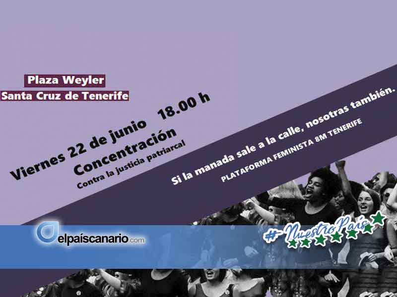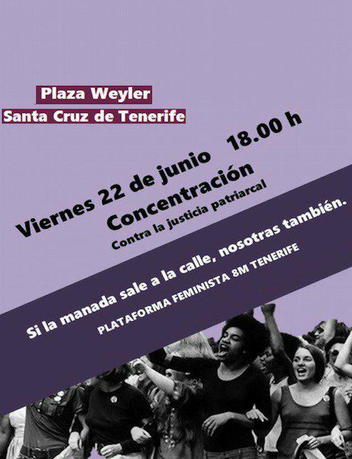 #AlertaFeminista Convocada concentración para este viernes ante la puesta en libertad provisional de la Manada. El movimiento feminista llama a concentrarse en la plaza Weyler (Secundino Delgado) de Santa Cruz a partir de las 18:00 horas.