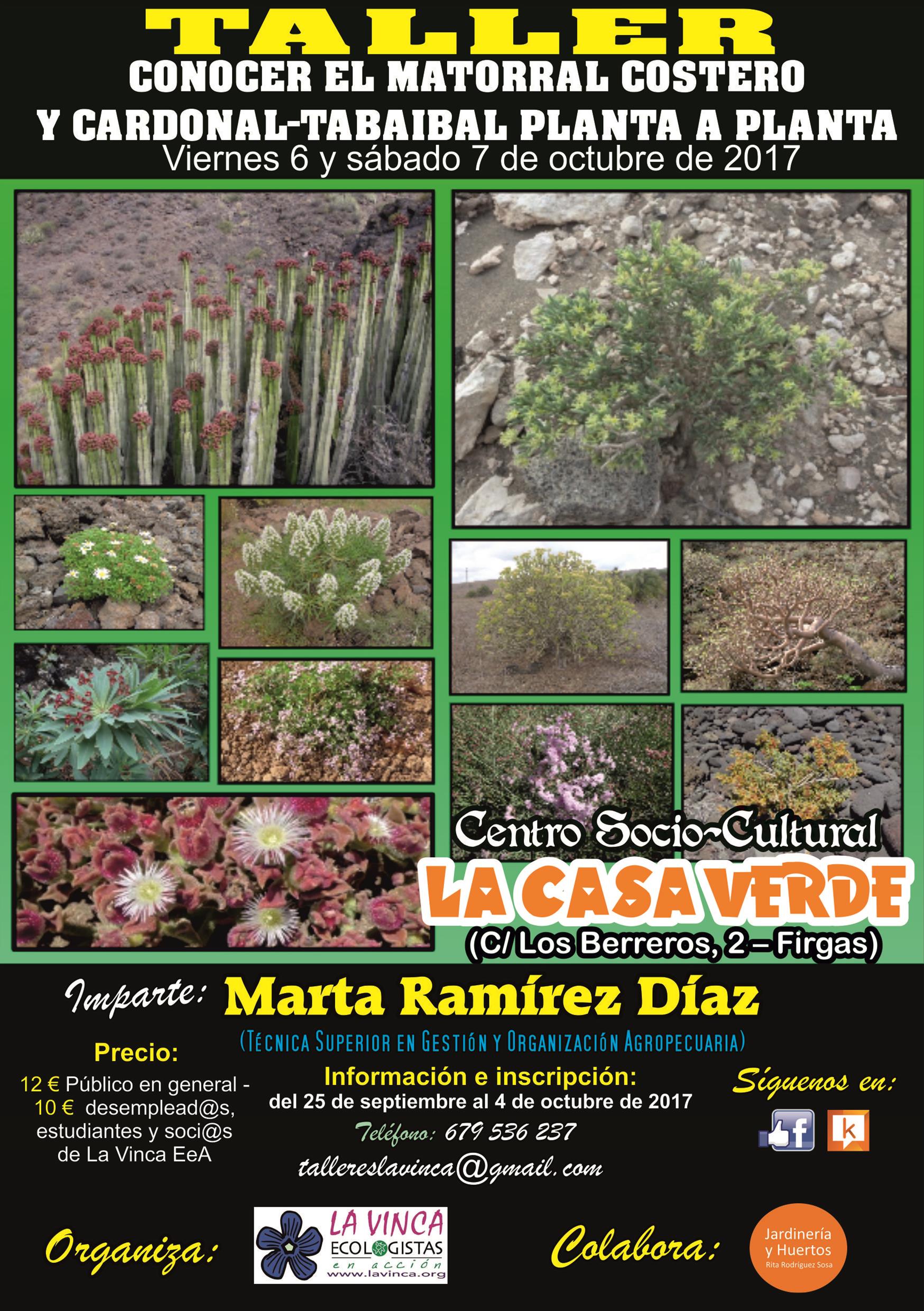 A partir de las 9.00 horas del lunes 25 de septiembre de 2017 se abre el plazo de inscripción para el TALLER “CONOCER EL MATORRAL COSTERO Y CARDONAL-TABAIBAL: PLANTA A PLANTA”, bajo la organización de LA VINCA Ecologistas en Acción, contando con la colaboración de Jardinería y Huertos Rita Rodríguez Sosa. Las personas interesadas en asistir al mismo pueden inscribirse llamando al teléfono 679 536 237 (Comisión de Formación de La Vinca EeA).