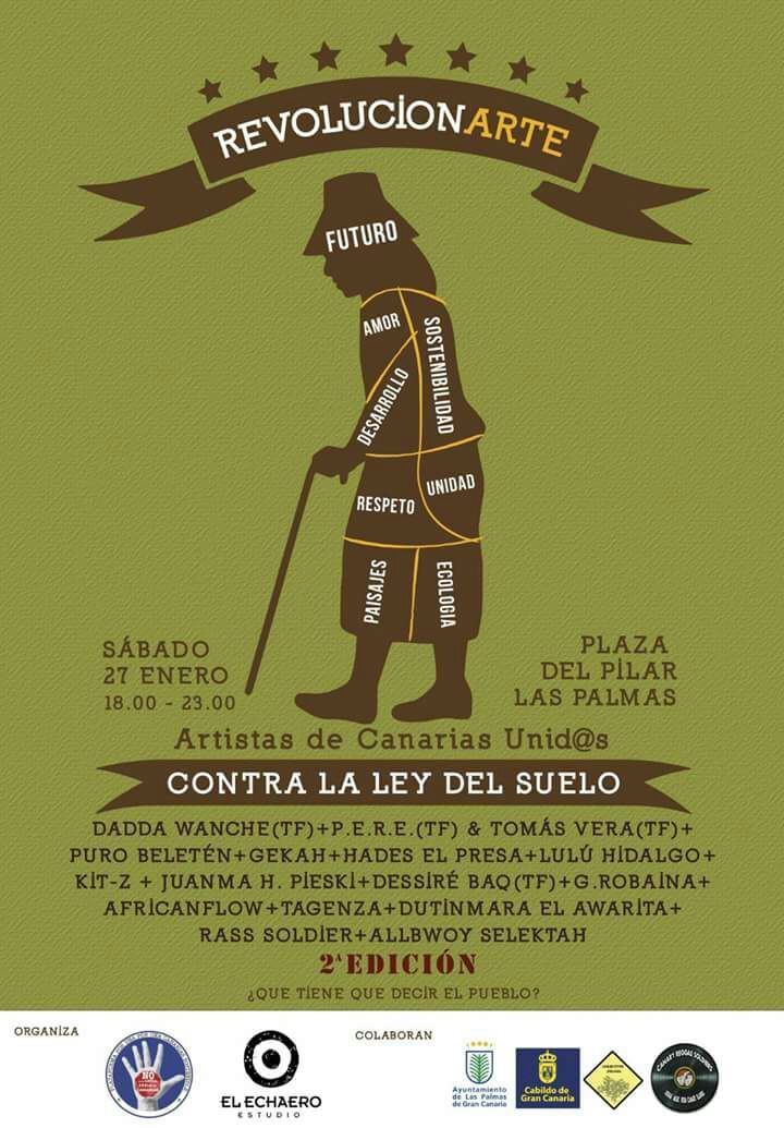 El último fin de semana de enero se presenta el RevolucionArte 2: De nuevo, Artistas de Canarias Unidos contra la Ley del Suelo. Quienes disfrutaron de la primera edición pueden imaginar la carga artística que ofrece esta segunda.