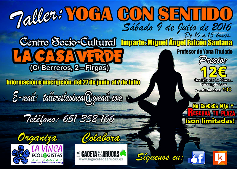 El lunes 27 de junio se abre el plazo de inscripción para el “TALLER DE YOGA CON SENTIDO”, actividad organizada por LA VINCA Ecologistas en Acción, con la colaboración de la web www.lagacetadearucas.es