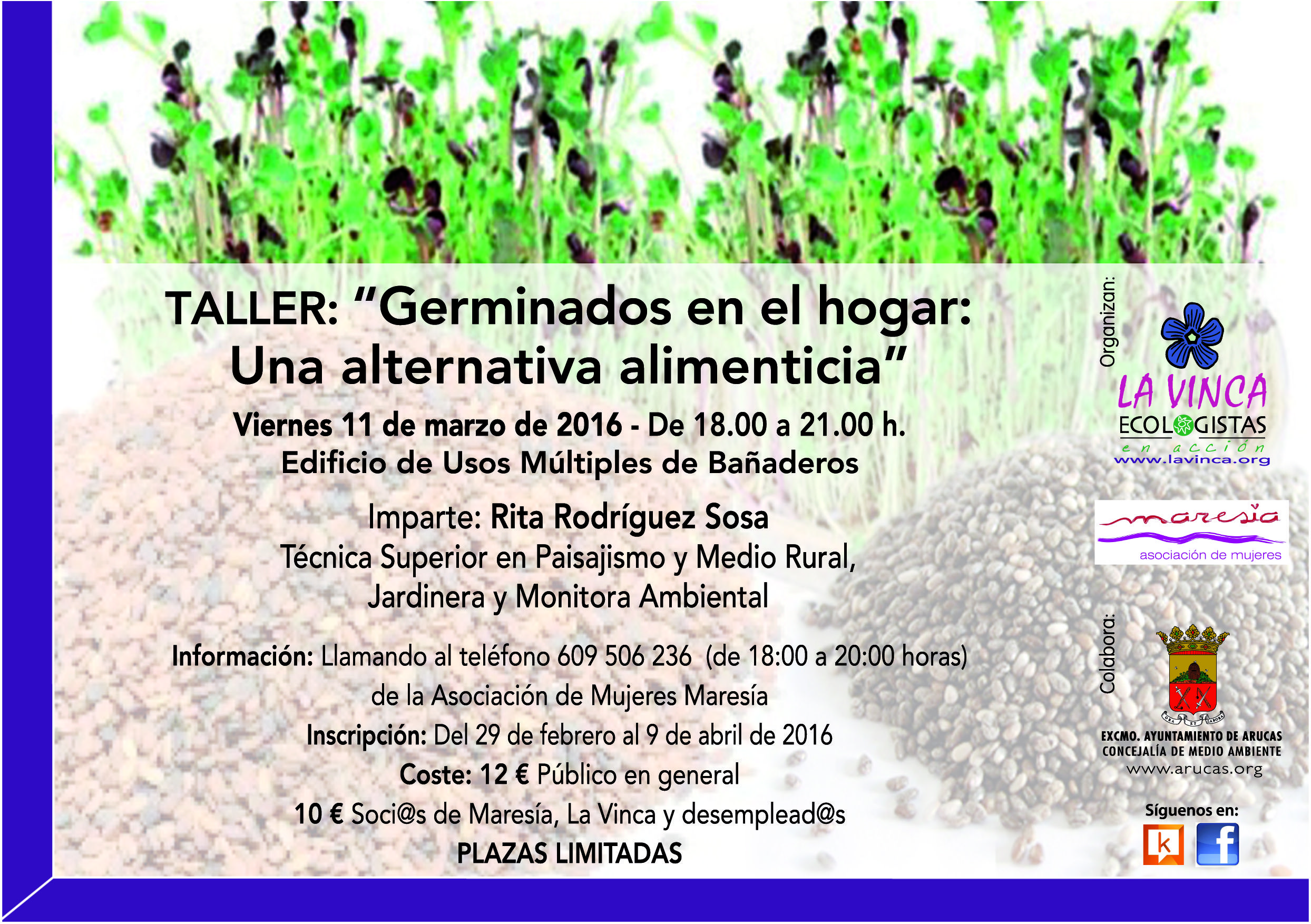 El lunes 29 de febrero se abre el plazo de inscripción para el TALLER: “GERMINADOS EN EL HOGAR. UNA ALTERNATIVA ALIMENTICIA” y las personas interesadas en asistir al mismo pueden inscribirse llamando al teléfono 609 506 236, llamando de 18.00 a 20.00 horas de lunes a viernes.