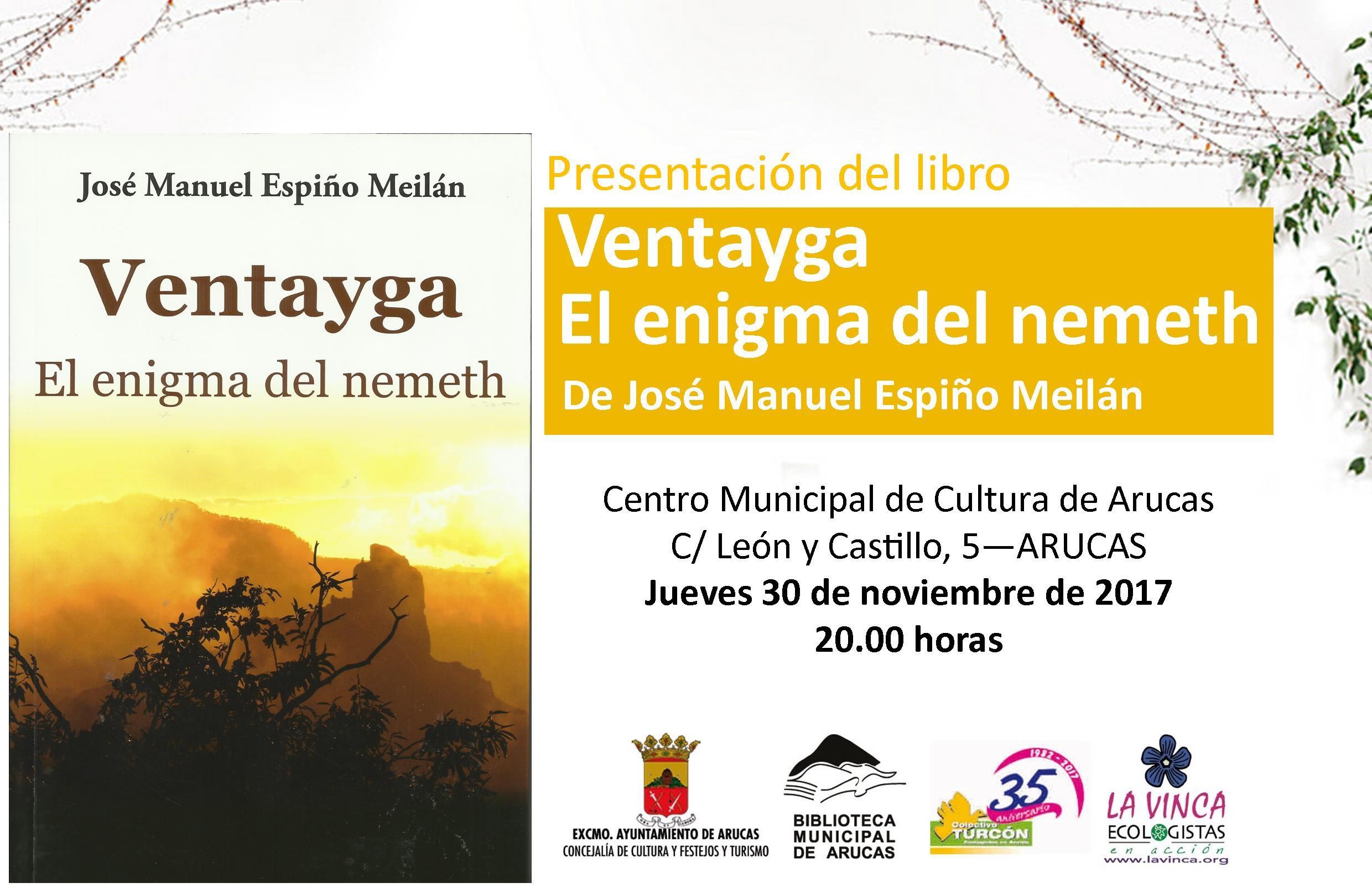 VENTAYGA, El enigma del nemeth”, es el último libro publicado de José Manuel Espiño Meilán, y se presentará al público el próximo jueves 30 de noviembre de 2017, a las 20.00 horas, en el Centro Municipal de Cultura de Arucas, sito en la calle León y Castillo, nº 5, de la ciudad aruquense.
