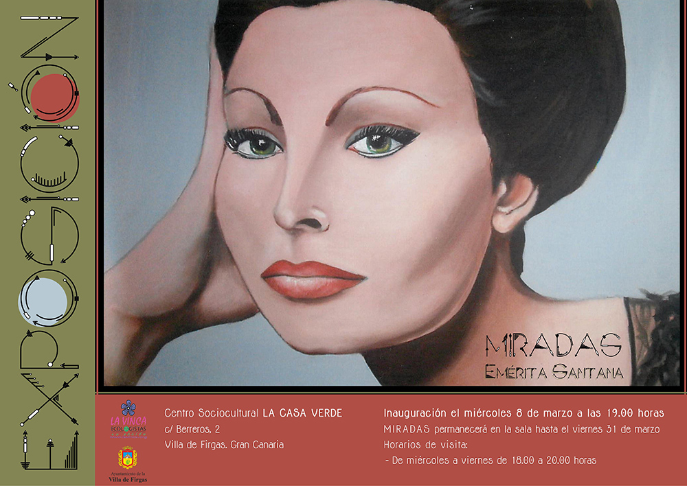 A las 19.00 horas se inaugura en el Centro Socio-Cultural LA CASA VERDE (C/ Los Berreros, nº 2 – Firgas) la Exposición Pictórica “MIRADAS”, de Emérita Santana, quien mostrará una veintena de sus oleos.