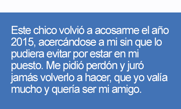 Este chico volvió a acosarme el año 2015, acercándose a mi sin que lo pudiera evitar por estar en mi puesto. Me pidió perdón y juró jamás volverlo a hacer, que yo valía mucho y quería ser mi amigo. Nada más lejos de la misma situación del año anterior, volvió a suceder. Lo tenía por la tienda preguntando siempre si necesitaba algo, agua, o lo que fuera. Esto era acoso, y yo temía decirle cuatro cosas y que me acabaran echando a mi del evento o que dijera cosas horribles de mi trabajo. Una era mucho más joven y no tenía unos ideales tan fuertes como hoy día.