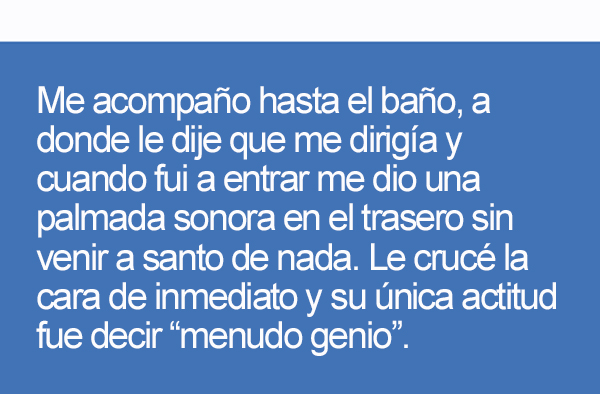 Una de las noches del evento, me disponía a bajar a lo baños de la zona de casetas donde me estaba quedando y me encontré de casualidad a este chico, quien también tenía acceso porque era participante. Algo que parecía una tontería se convirtió en un escándalo. Me acompaño hasta el baño, a donde le dije que me dirigía y cuando fui a entrar me dio una palmada sonora en el trasero sin venir a santo de nada. Le crucé la cara de inmediato y su única actitud fue decir “menudo genio”. ¿Veis por donde voy? Era un machista y un acosador, y tuve que pedir ayuda a seguridad para que no se acercara más a mi durante los días restantes y protegerme tras mi pareja, quien ante todo esto tuvo que mantener una compostura de hierro, ya que por suerte es de todo menos machista y sabe que ponerse al nivel de esas personas no lleva a nada y que por lo tanto debe actuar la seguridad del recinto.