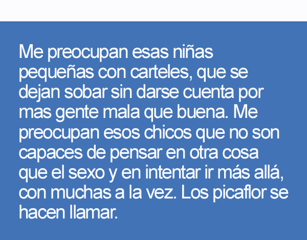 Me preocupan esas niñas pequeñas con carteles, que se dejan sobar sin darse cuenta por mas gente mala que buena. Me preocupan esos chicos que no son capaces de pensar en otra cosa que el sexo y en intentar ir más allá, con muchas a la vez. Los picaflor se hacen llamar. Y creo que aunque un abrazo sea algo maravilloso no todos deberían poder tener el poder de utilizar esa arma de doble filo sin licencia. Por tanto, ¿lo mejor sería la prohibición?. Pues si, igual que se ha hecho con las armas, tienes que pasar un test pasa poder llevar una. ¿Qué es esto de que puedan ir con un cartel que dice “¿hacemos yuri?”? Y delante miá vi que eran dos chicas besándose de ciertas maneras delante del chico que las parase. Yo me pregunto con estas cosas a donde vamos a llegar, dándole este contexto y ridiculizando la lucha por el respeto hacia las mujeres.