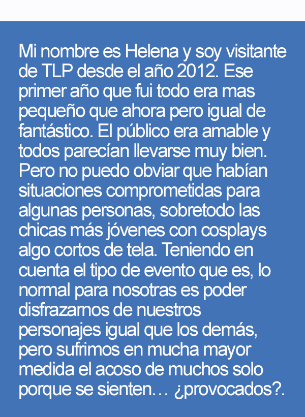 Mi nombre es Helena y soy visitante de TLP desde el año 2012. Ese primer año que fui todo era mas pequeño que ahora pero igual de fantástico. El público era amable y todos parecían llevarse muy bien. Pero no puedo obviar que habían situaciones comprometidas para algunas personas, sobretodo las chicas más jóvenes con cosplays algo cortos de tela. Teniendo en cuenta el tipo de evento que es, lo normal para nosotras es poder disfrazarnos de nuestros personajes igual que los demás, pero sufrimos en mucha mayor medida el acoso de muchos solo porque se sienten… ¿provocados?.