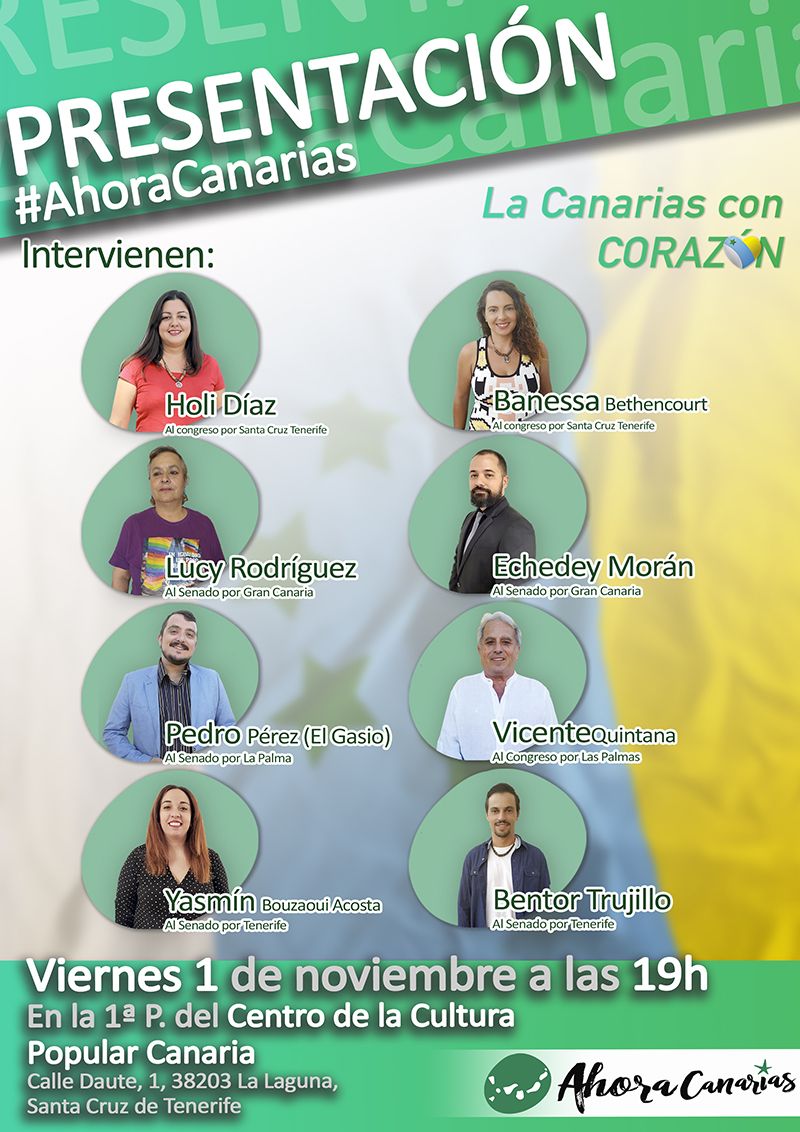 La presentación de la coalición AHORA CANARIAS tendrá lugar este viernes 1 de noviembre a las 19:00 horas en el Centro de la Cultura Popular Canaria, en la ciudad de La Laguna, calle Daute Nº 1.