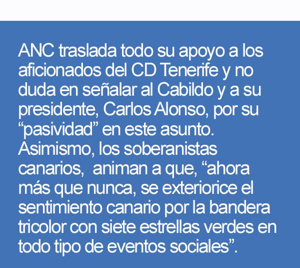 ANC traslada todo su apoyo a los aficionados del CD Tenerife y no duda en señalar al Cabildo y a su presidente, Carlos Alonso, por su “pasividad” en este asunto. Asimismo, los soberanistas canarios,  animan a que, “ahora más que nunca, se exteriorice el sentimiento canario por la bandera tricolor con siete estrellas verdes en todo tipo de eventos sociales”.