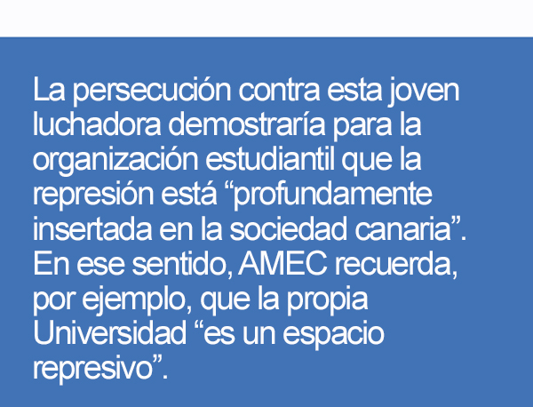 La persecución contra esta joven luchadora demostraría para la organización estudiantil que la represión está “profundamente insertada en la sociedad canaria”. En ese sentido, AMEC recuerda, por ejemplo, que la propia Universidad “es un espacio represivo”.