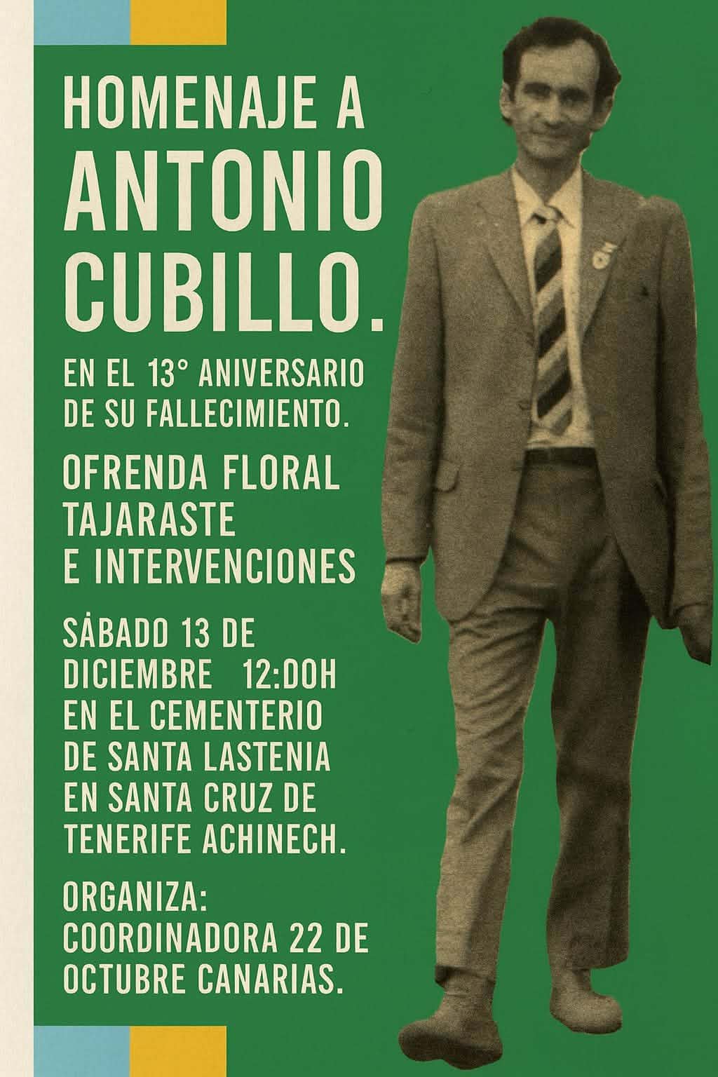 El próximo sábado 13 de diciembre, a las 12:00 horas, tendrá lugar un solemne homenaje a la memoria de don Antonio Cubillo en el Cementerio de Santa Lastenia (Santa Cruz de Tenerife).