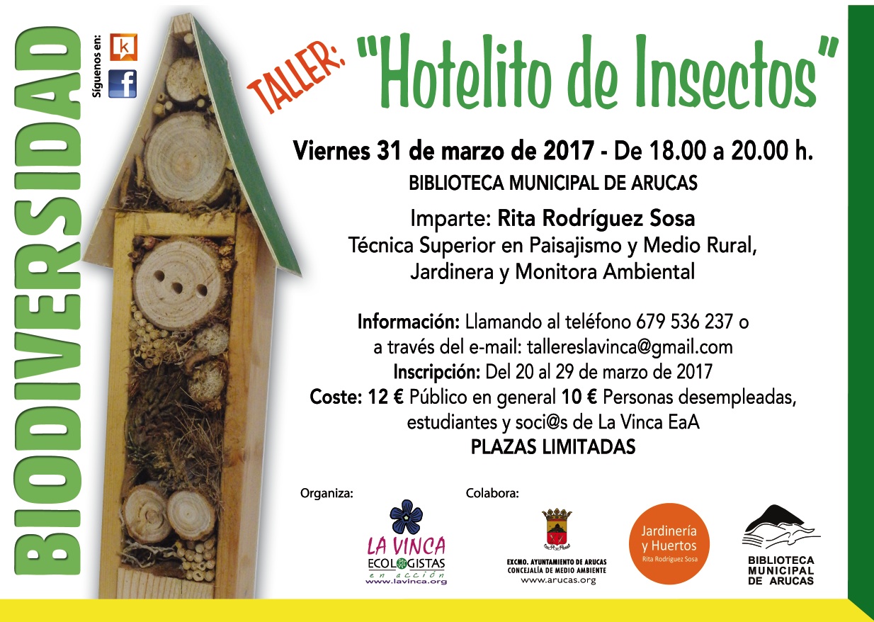 A partir de las 9.00 horas del lunes 20 de marzo se abre el plazo de inscripción para el TALLER “HOTELITO DE INSECTOS”, bajo la organización de LA VINCA Ecologistas en Acción, contando con la colaboración de la Concejalía de Medio Ambiente del Ayuntamiento de Arucas, Biblioteca Municipal de Arucas y Jardinería y Huertos Rita Rodríguez Sosa. Las personas interesadas en asistir al mismo pueden inscribirse llamando al teléfono 679 536 237 (Comisión de Formación de La Vinca EeA).