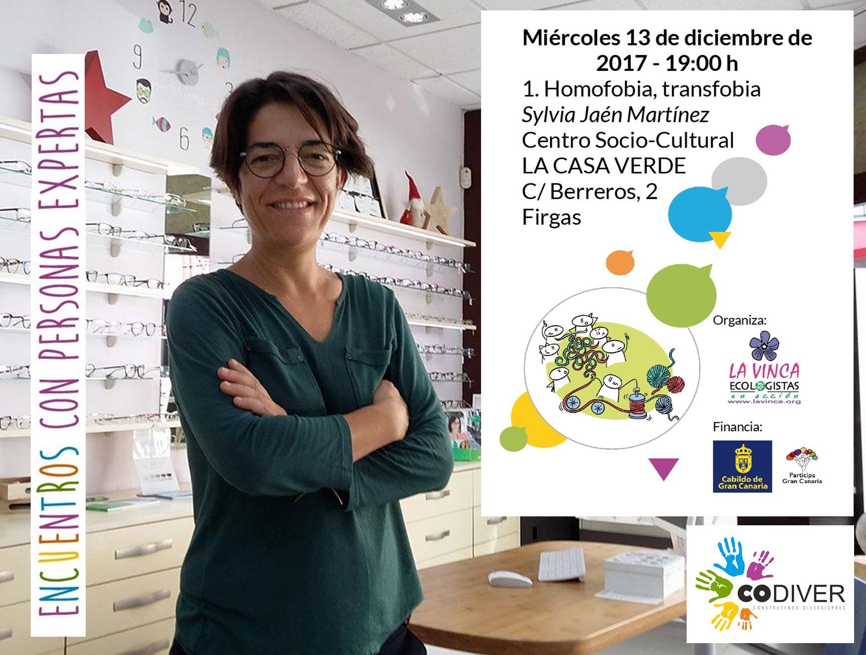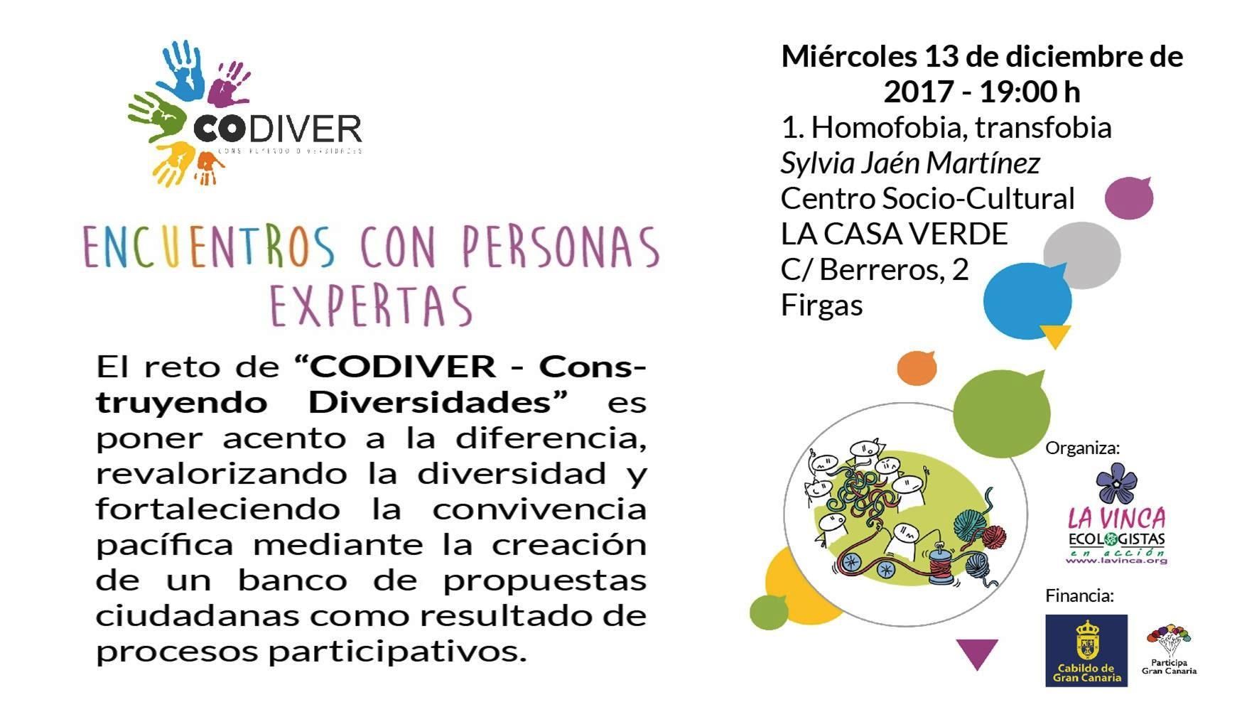 Esta novedosa propuesta participativa está incluida en el Proyecto “Construyendo Diversidades – CODIVER 2017”, organizada por el colectivo LA VINCA Ecologistas en Acción. La primera de estas sesiones se desarrollará el miércoles 13 de diciembre de 2017, a las 19.00 horas, en el Centro Socio-Cultural LA CASA VERDE (C/ Los Berreros, nº 2 – Firgas) y se contará como primera EXPERTA con Sylvia Jaén Martínez, que hablará sobre LGTBIFOBIA, con el siguiente formato: