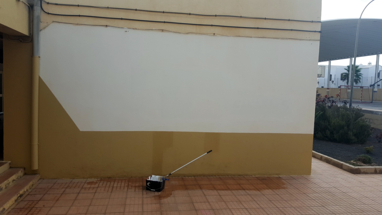 El mural representa una manifestación artística, que como dije anteriormente, fue realizada por el alumnado para conmemorar el día de Canarias y consiste en un mural de la bandera de Canarias donde el azul central es un azul marino bastante llamativo y las 7 estrellas verdes no ocupa la parte central, sino que amplía su campo de acción en toda la franja central y una estrella ocupa la franja amarilla y otra la franja blanca.