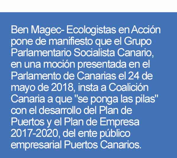 Ben Magec- Ecologistas en Acción pone de manifiesto que el Grupo Parlamentario Socialista Canario, en una moción presentada en el Parlamento de Canarias el 24 de mayo de 2018, insta a Coalición Canaria a que «se ponga las pilas» con el desarrollo del Plan de Puertos y el Plan de Empresa 2017-2020, del ente público empresarial Puertos Canarios.
