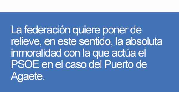 La federación quiere poner de relieve, en este sentido, la absoluta inmoralidad con la que actúa el PSOE en el caso del Puerto de Agaete. Así, al mismo tiempo que defienden una consulta popular en este municipio para que los vecinos y vecinas elijan si quieren o no una nueva mega infraestructura portuaria, instan al Gobierno de Canarias (como puede verse en el punto 12 de la moción) a acelerar su licitación.