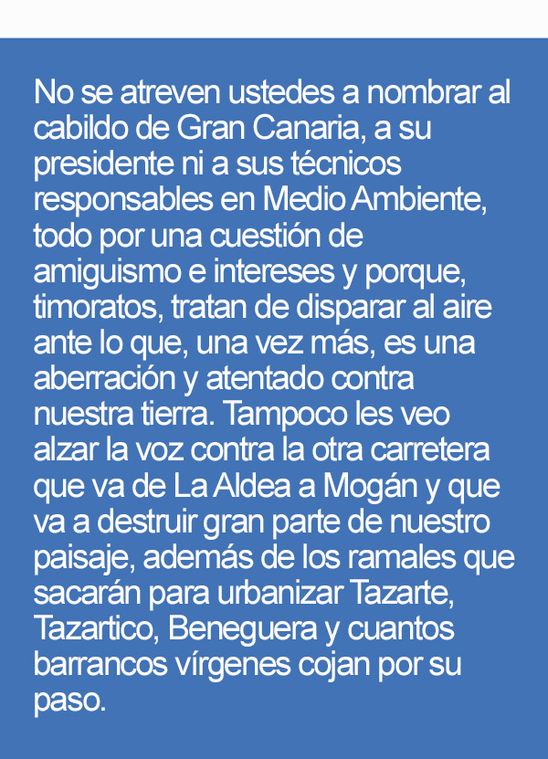 No se atreven ustedes a nombrar al cabildo de Gran Canaria, a su presidente ni a sus técnicos responsables en Medio Ambiente, todo por una cuestión de amiguismo e intereses y porque, timoratos, tratan de disparar al aire ante lo que, una vez más, es una aberración y atentado contra nuestra tierra. Tampoco les veo alzar la voz contra la otra carretera que va de La Aldea a Mogán y que va a destruir gran parte de nuestro paisaje, además de los ramales que sacarán para urbanizar Tazarte, Tazartico, Beneguera y cuantos barrancos vírgenes cojan por su paso.