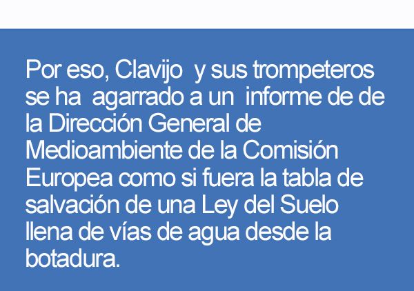 Por eso, Clavijo y sus trompeteros se ha agarrado a un informe de de la Dirección General de Medioambiente de la Comisión Europea como si fuera la tabla de salvación de una Ley del Suelo llena de vías de agua desde la botadura.