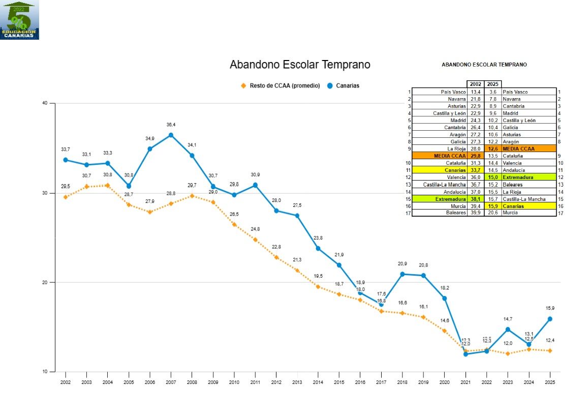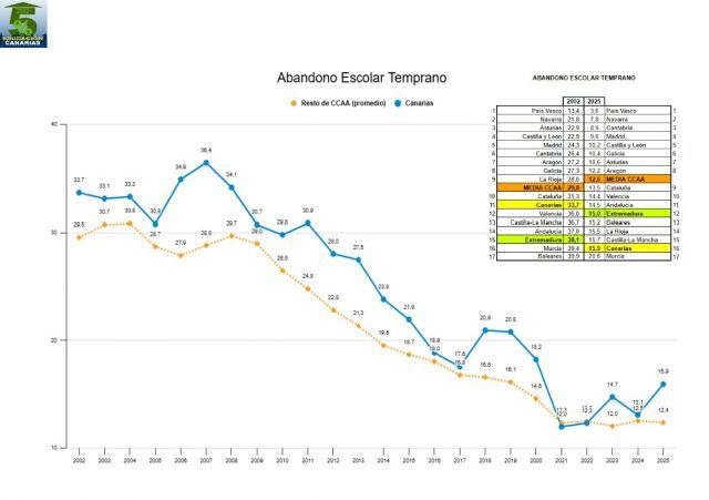 Los datos oficiales recientemente publicados confirman una tendencia profundamente preocupante: el abandono escolar temprano en Canarias vuelve a repuntar en 2025 hasta situarse en el 15,9%. Esta cifra no solo consolida tres años consecutivos de empeoramiento, sino que amplía la brecha con la media estatal, que continúa descendiendo y se sitúa ya en el 12,8%. Mientras España mejora de forma sostenida, Canarias retrocede.