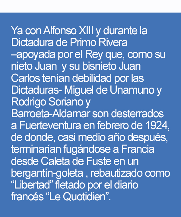 Ya con Alfonso XIII y durante la Dictadura de Primo Rivera –apoyada por el Rey que, como su nieto Juan y su bisnieto Juan Carlos tenían debilidad por las Dictaduras- Miguel de Unamuno y Rodrigo Soriano y Barroeta-Aldamar son desterrados a Fuerteventura en febrero de 1924, de donde, casi medio año después, terminarían fugándose a Francia desde Caleta de Fuste en un bergantín-goleta , rebautizado como “Libertad” fletado por el diario francés “Le Quotidien” (Soriano, exiliado luego a Uruguay, fundó allí en 1934 con la lagunera Mercedes Pinto la “Asociación Republicana Española” de Montevideo).