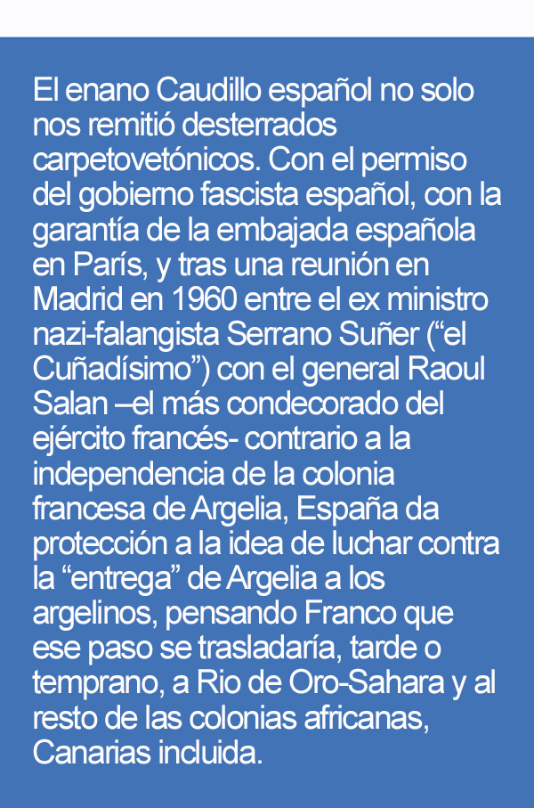 El enano Caudillo español no solo nos remitió desterrados carpetovetónicos. Con el permiso del gobierno fascista español, con la garantía de la embajada española en París, y tras una reunión en Madrid en 1960 entre el ex ministro nazi-falangista Serrano Suñer (“el Cuñadísimo”) con el general Raoul Salan –el más condecorado del ejército francés- contrario a la independencia de la colonia francesa de Argelia, España da protección a la idea de luchar contra la “entrega” de Argelia a los argelinos, pensando Franco que ese paso se trasladaría, tarde o temprano, a Rio de Oro-Sahara y al resto de las colonias africanas, Canarias incluida. De todas formas, el enano dictador con la estrategia reptilesca que le caracterizaba, al mismo tiempo que acogía a los disidentes franceses pasaba armas egipcias y españolas para el FLN argelino. Resultado de esa cooperación española, en febrero de 1961, en el Hotel Princesa, piso 12 de la Torre de Madrid en la Plaza de España de la capital de la metrópoli, se funda la OAS, “Organisation de l’Armée Secrète” que llegó a contar con más de 3.000 militantes, un tercio de ellos armados que, en solo su primer año de existencia, realizó en Francia más de 750 atentados y miles de asesinatos en Argelia.