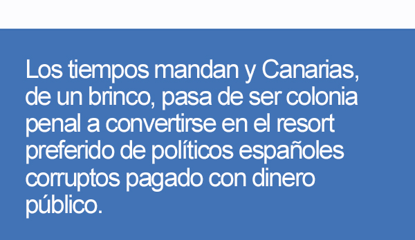 Los tiempos mandan y Canarias, de un brinco, pasa de ser colonia penal a convertirse en el resort preferido de políticos españoles corruptos pagado con dinero público. No cuento aquí a la caterva varia de ministros y otros caballeros de parecido pelaje que venían a Canarias “oficialmente”. Ni siquiera el de aquel ministro de agricultura franquista que, viendo desde lo alto el terrible destrozo causado en la platanera por un temporal, exclamaba al ver las matas caídas: “Al menos salvarán la madera”. El verdadero iniciador de este turismo tan específico fue, nada menos, que el inefable autor de la esperpéntica frase de “Cuanto peor mejor para todos y cuanto peor para todos mejor, mejor para mí el suyo beneficio político”, el Sr Rajoy, presidente perfecto del estado hecho a la medida española, que en la primavera de 2004, para reponerse de la derrota electoral ante Zapatero, recibe como regalo un viajito y unas vacaciones familiares con Elvira y Marianito Jr. en Maspalomas.