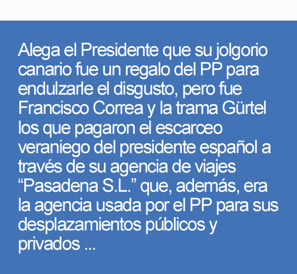 Alega el Presidente que su jolgorio canario fue un regalo del PP para endulzarle el disgusto, pero fue Francisco Correa y la trama Gürtel los que pagaron el escarceo veraniego del presidente español a través de su agencia de viajes “Pasadena S.L.” que, además, era la agencia usada por el PP para sus desplazamientos públicos y privados desde que el corrupto Francisco Álvarez Cascos –ahora con un alzhéimer galopante que hace que no se acuerde de nada de la trama de sobresueldos y corruptelas peperas- introdujo a Correa en la trama de corrupciones, trapisondas y amaños del PP. La trama Gürtel pagó, además de la estancia, los viajes de Mariano, Elvira, Marianito y una criada a su servicio, mientras que el ministerio de la presidencia pagaba los escoltas que lo acompañaron. Pablo Crespo, el adjunto de Correa, comentó que “pagamos a este hijo de puta de Rajoy el viaje para que se largase a Canarias a llorar sus penas porque había perdido las elecciones, y encima se llevó a la familia” (El Plural 1 Feb 2015)