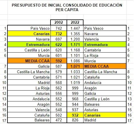 Canarias ha pasado de tener en 2002 el segundo mayor Presupuesto Inicial Consolidado de Educación per cápita a ocupar la penúltima posición en 2022.