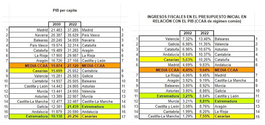 Como se puede comprobar en las tablas anteriores, en dos décadas nuestro PIB per cápita ha caído desde la media de las CCAA a la cola. En ese periodo nuestros ingresos fiscales en relación al PIB han caído desde la quinta a la última posición.