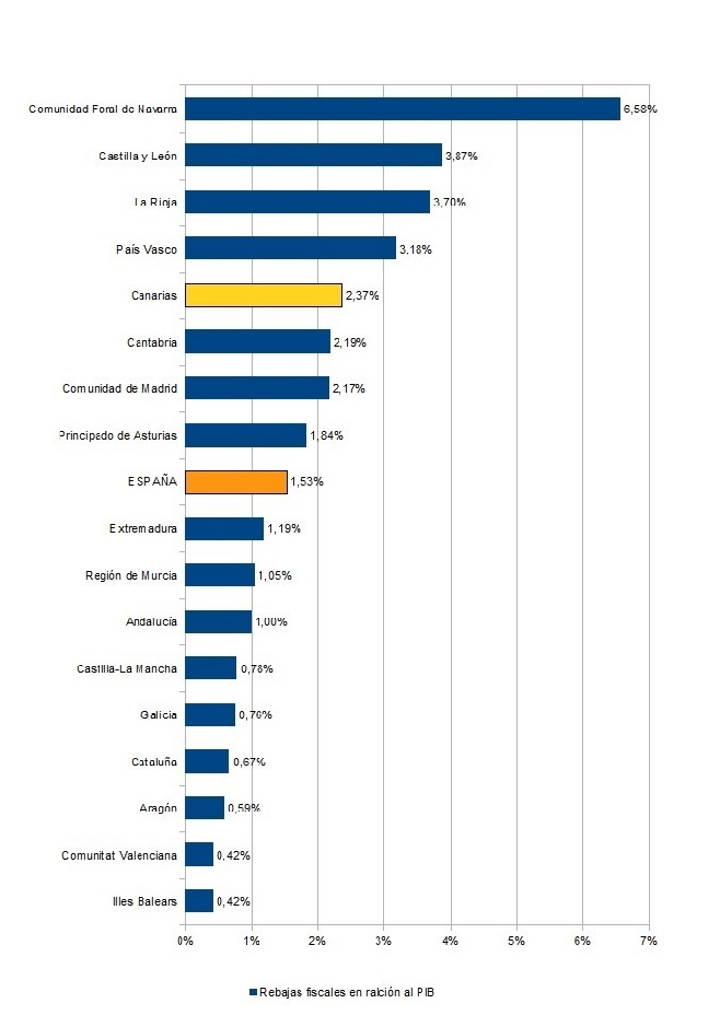 Por otro lado, cuando se relacionan las rebajas fiscales publicadas por un reciente trabajo del periódico Público con el PIB regional se comprueba que Canarias deja de ingresar 1.082 millones de euros por este concepto y se sitúa entre las comunidades que más rebajas fiscales ha realizado, alcanzando el 2,4% del PIB.