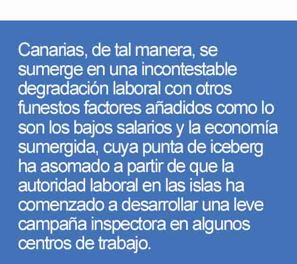 Canarias, de tal manera, se sumerge en una incontestable degradación laboral con otros funestos factores añadidos como lo son los bajos salarios y la economía sumergida, cuya punta de iceberg ha asomado a partir de que la autoridad laboral en las islas ha comenzado a desarrollar una leve campaña inspectora en algunos centros de trabajo.
