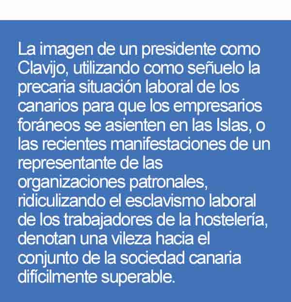 La imagen de un presidente como Clavijo, utilizando como señuelo la precaria situación laboral de los canarios para que los empresarios foráneos se asienten en las Islas, o las recientes manifestaciones de un representante de las organizaciones patronales, ridiculizando el esclavismo laboral de los trabajadores de la hostelería, denotan una vileza hacia el conjunto de la sociedad canaria difícilmente superable.