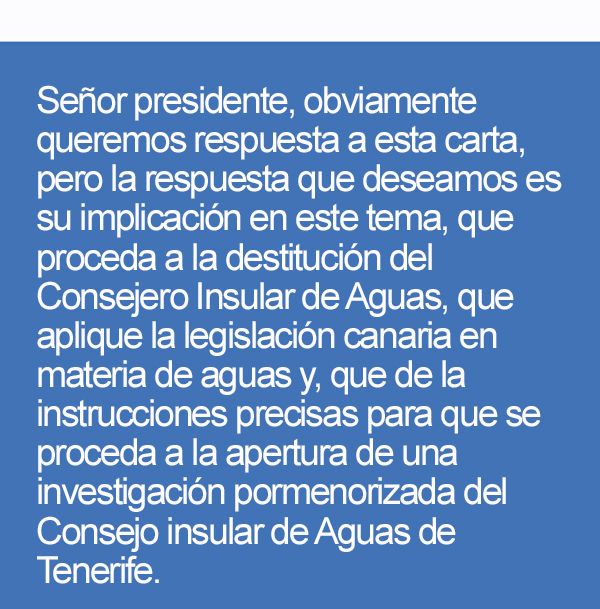 Señor presidente, obviamente queremos respuesta a esta carta, pero la respuesta que deseamos es su implicación en este tema, que proceda a la destitución del Consejero Insular de Aguas, que aplique la legislación canaria en materia de aguas y, que de la instrucciones precisas para que se proceda a la apertura de una investigación pormenorizada del Consejo insular de Aguas de Tenerife. La corrupción no solo es la apropiación indebida de dinero público, también lo es la utilización indebida de las instituciones públicas.