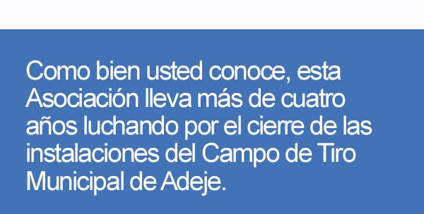Como bien usted conoce, esta Asociación lleva más de cuatro años luchando por el cierre de las instalaciones del Campo de Tiro Municipal de Adeje. A usted se le ha comunicado personalmente nuestras inquietudes y la problemática de la situación, le hemos hecho llegar las distintas irregularidades que envuelven ente campo de tiro, pero los últimos acontecimientos surgidos desde el CIATF nos lleva a pensar que situaciones extrañas están ocurriendo en ese organismo.