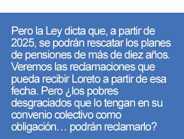 La promoción del Estado es tal que el pasado febrero entró en vigor una ley que llama la atención por autorizar la recuperación del capital invertido en planes de pensiones, una vez pasado un mínimo de diez años de cotización. Hoy, esto no se puede hacer con Loreto. Pero la Ley dicta que, a partir de 2025, se podrán rescatar los planes de pensiones de más de diez años. Veremos las reclamaciones que pueda recibir Loreto a partir de esa fecha. Pero ¿los pobres desgraciados que lo tengan en su convenio colectivo como obligación… podrán reclamarlo?