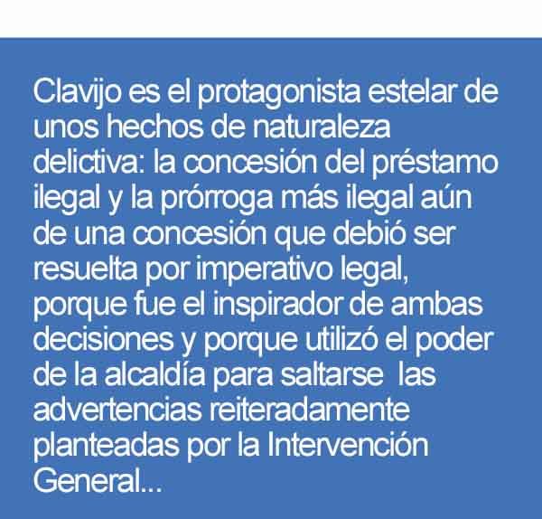 Clavijo es el protagonista estelar de unos hechos de naturaleza delictiva: la concesión del préstamo ilegal y la prórroga más ilegal aún de una concesión que debió ser resuelta por imperativo legal, porque fue el inspirador de ambas decisiones y porque utilizó el poder de la alcaldía para saltarse  las advertencias reiteradamente planteadas por la Intervención General , que es el órgano a quien corresponde el control previo de legalidad de todos los actos del Ayuntamiento que  generan  obligaciones económicas para la Hacienda municipal.