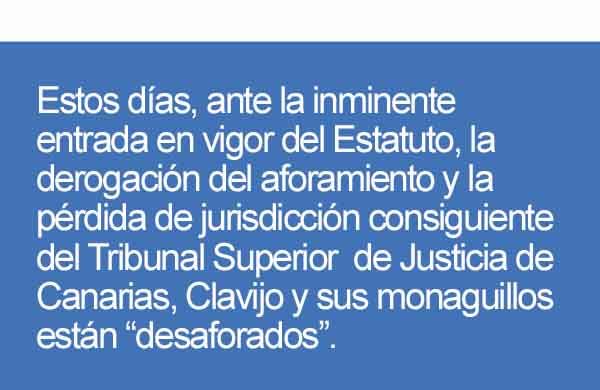 Estos días, ante la inminente entrada en vigor del Estatuto, la derogación del aforamiento y la pérdida de jurisdicción consiguiente del Tribunal Superior  de Justicia de Canarias, Clavijo y sus monaguillos  están “desaforados”.