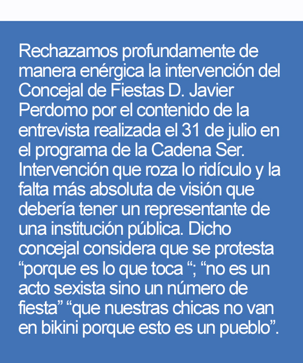 7.- Rechazamos profundamente de manera enérgica la intervención del Concejal de Fiestas D. Javier Perdomo por el contenido de la entrevista realizada el 31 de julio en el programa de la Cadena Ser. Intervención que roza lo ridículo y la falta más absoluta de visión que debería tener un representante de una institución pública. Dicho concejal considera que se protesta “porque es lo que toca “; “no es un acto sexista sino un número de fiesta”; “que nuestras chicas no van en bikini porque esto es un pueblo”. También nos deleita con un rosario de criterios para la elección de la reina en antena tales como: “la soltura en el escenario, la simpatía, el vestido y la gracia”. Ya esto es intolerable y mezquino olvidándose de los valores, las inquietudes, las capacidades, las potencialidades que tienen las futuribles candidatas, demostrando una vez más lo inapropiado y lo soez de un concejal entorno a la defensa de un acto que él considera que el “público” (¡para nosotrxs ciudadanxs!) lo ha solicitado. Utiliza la expresión “las muchachas nos lo han pedido” y que “han recibido muchas llamadas” Que sepamos no se han puesto en marcha ningún tipo de mecanismo de consulta popular, cosa que acordó el grupo de gobierno en septiembre del año pasado para la celebración de las fiestas.
