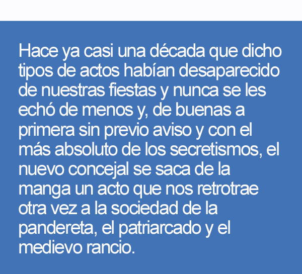 1.- Hace ya casi una década que dicho tipos de actos habían desaparecido de nuestras fiestas y nunca se les echó de menos y, de buenas a primera sin previo aviso y con el más absoluto de los secretismos, el nuevo concejal se saca de la manga un acto que nos retrotrae otra vez a la sociedad de la pandereta, el patriarcado y el medievo rancio. El culto a la belleza como manera de exhibir a mujeres con el mero hecho de adornar y utilizarlas como tarjeta y postal de nuestras fiestas sin entrar a hacer valoraciones del tipo de capacidades, inteligencia, logros, metas e inquietudes. Reforzando una vez más, el carácter de embellecimiento y de princesas que deben tener este tipo de actos para congratule de un cierto grupo de personas. Una vez más, nos encontramos con un refuerzo del carácter de objeto que parece tiene nuestra corporación asignando por undécima vez el rol que tienen que cumplir las mujeres en esta sociedad, esto es, estar guapas y adornar los actos públicos y por tanto, ser elementos puramente decorativos. No se trata de la elección de carácter individual de las personas (cada persona es libre de hacer), cosa que no negamos. Se trata de que una institución pública como es el Aytmo se permita el desaire de apoyar y promover este tipo de actos, contraviniendo mandatos constitucionales y éticos que se debe plantear una sociedad moderna.